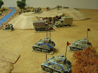 The game will be loosely based on the Mancheti scenario in Benghazi Handicap; but it will be shifted to East Africa and called Femmecheti. Next week I'll outline the scenario with deployment map and force composition for Piquet's Field of Battle WWII rules. Until then, here are some shot of Mark D's 28mm figures and armour. I'm unsure of manufacturer for any of these troops; but most of the lorries are various die cast baker's vans ('collectors' toys) painted up for the desert - they are Mark's favourites; because he only paid about £1 each for them.