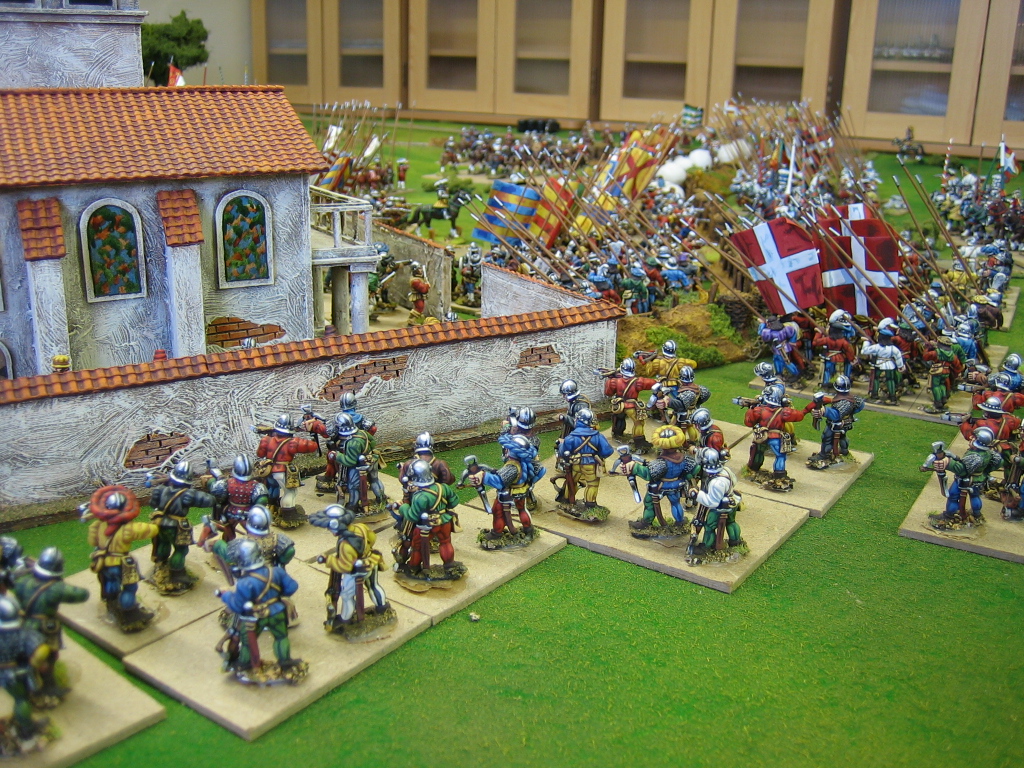 The battle at the barricades and ditch is in full swing. The French Landslnechts are being held back under muderous fire from artillery and Spanish arquebusier. The battle is in the balance.